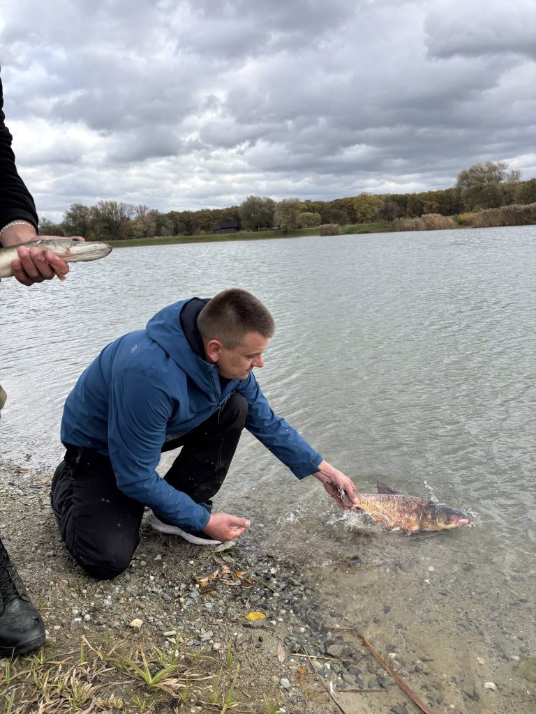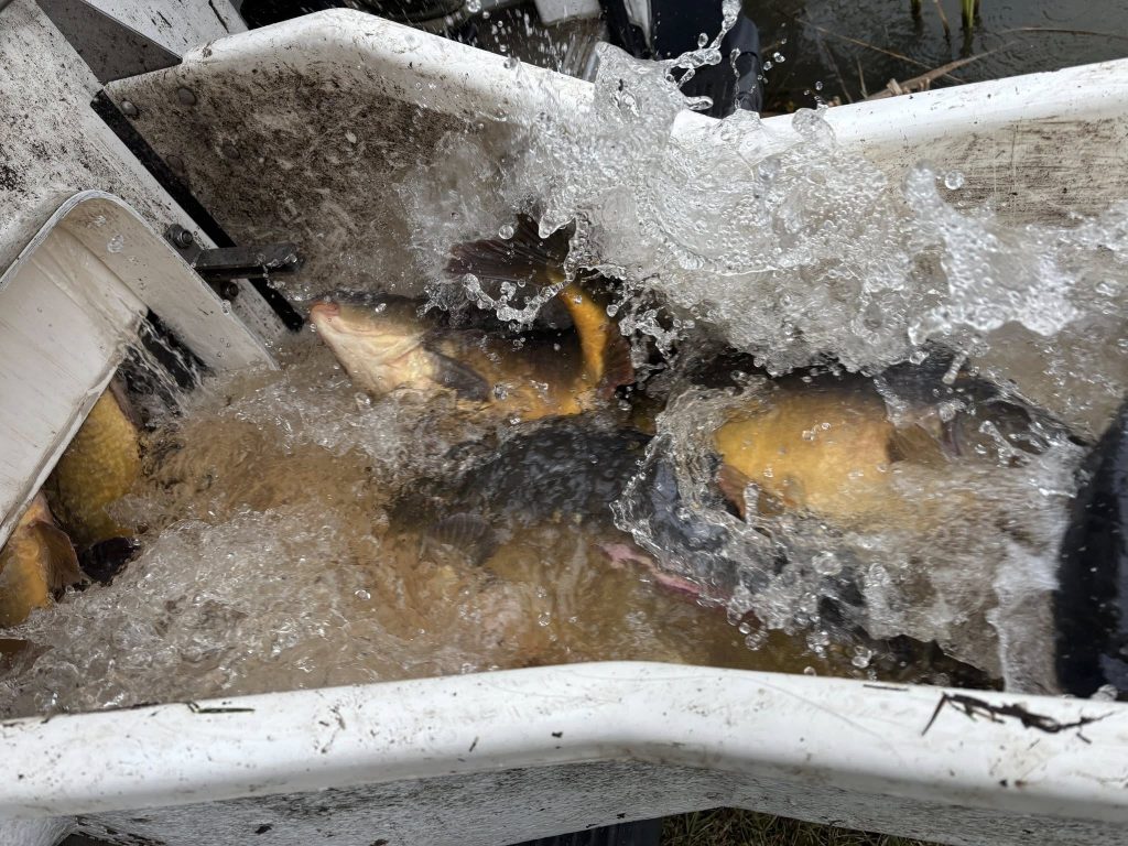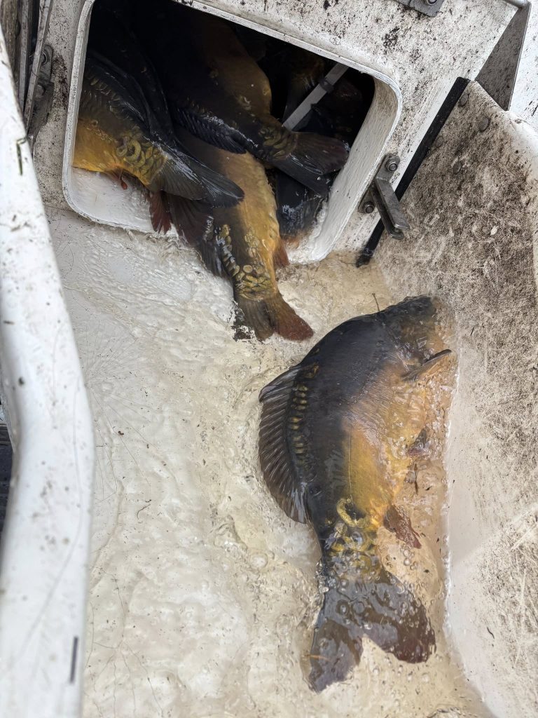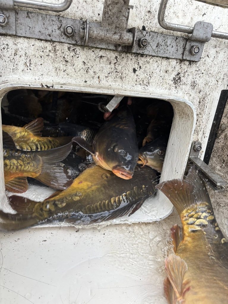 ZARYBIANIE DYŻY STAW JESIEŃ 2025 28 października 2025 / Dziś do naszego dużego stawu wpłynęło: Karp 700 kg Szczupak 150 kg Tołpyga 200 kg Proces przebiegł pod bacznym okiem Łabędzia Kazia, który witał nowe ryby. Dziękujemy Gospodarstwo Rybackie BUDY – Grzegorz Wójcicki za współpracę .